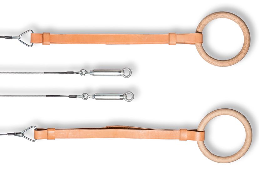Kompletní souprava se 70 cm dlouhými koženými řemeny, bez úvazku. Kruhy z vrstveného dřeva, lana z ocelového drátu potažené plastem s nalisovaným a tlumeným zavěšením na kuličkových ložiscích, nastavitelné do 3 cm. Cena pro závěsnou výšku 5,50 m (jiné závěsné výšky možné).